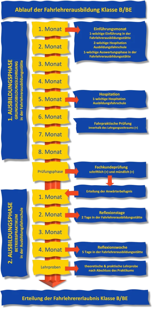 1. Ausbildungsphase: Die Ausbildung beginnt im 1. Monat mit der Einführungsphase in der Fahrlehrerausbildungsstätte. Davon bist du in der 2. und 3. Ausbildungswoche für eine zweiwöchige Hospitation in der Ausbildungsfahrschule. (Es ist daher dringend erforderlich, sich vor Beginn der Ausbildung um eine Ausbildungsfahrschule zu bemühen).