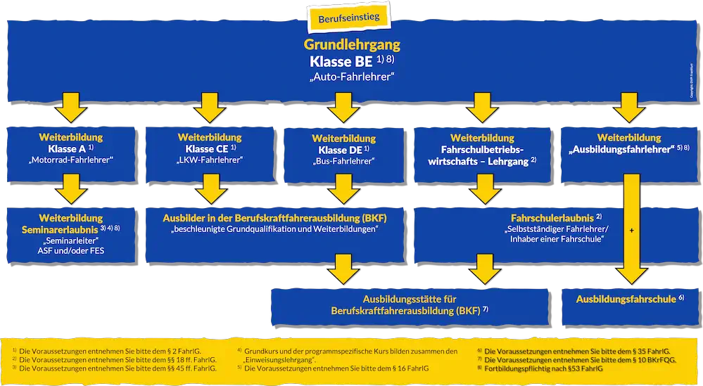 Mit dem erfolgreichen Abschluss des Grundlehrgangs der Klasse BE beginnt für Dich der Weg in den Fahrlehrerberuf. Doch damit ist Deine Entwicklung noch nicht abgeschlossen – im Gegenteil: Als Fahrlehrer stehen Dir vielfältige Weiterbildungsmöglichkeiten offen, mit denen Du Dich beruflich spezialisieren, neue Zielgruppen erschließen oder den Schritt in die Selbstständigkeit wagen kannst.